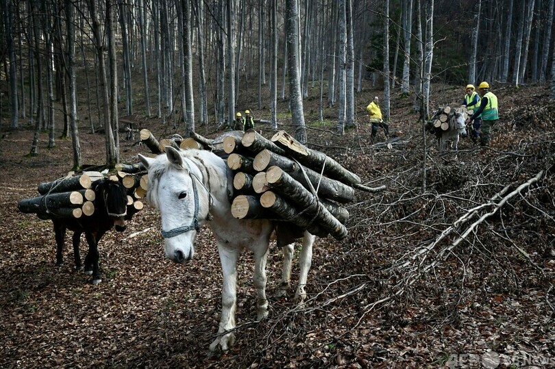 【12月15日 AFP】ブルガリアの冬はすぐそこまで来ているが、北部の山々の森には今もチェーンソーの音が響いている。切り出されたばかりのまきを運ぶため、馬たちはすぐそばに待機している。
