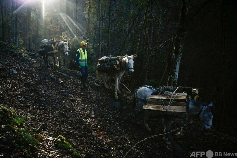 【12月15日 AFP】ブルガリアの冬はすぐそこまで来ているが、北部の山々の森には今もチェーンソーの音が響いている。切り出されたばかりのまきを運ぶため、馬たちはすぐそばに待機している。