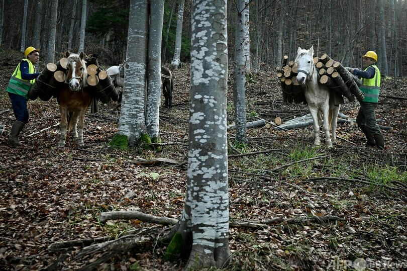 【12月15日 AFP】ブルガリアの冬はすぐそこまで来ているが、北部の山々の森には今もチェーンソーの音が響いている。切り出されたばかりのまきを運ぶため、馬たちはすぐそばに待機している。