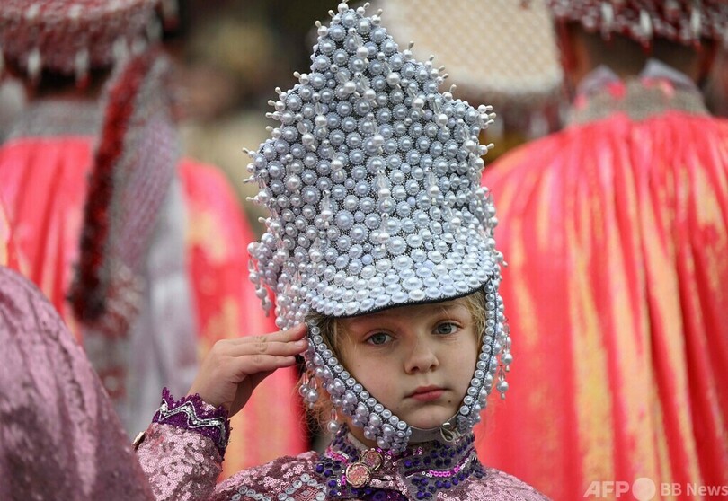 ビーズのヘッドピースや本物のクマの毛皮でできた服など、各地の伝統衣装を身にまとった人々が歌やダンスを披露しながら通りを練り歩いた。(c)AFP