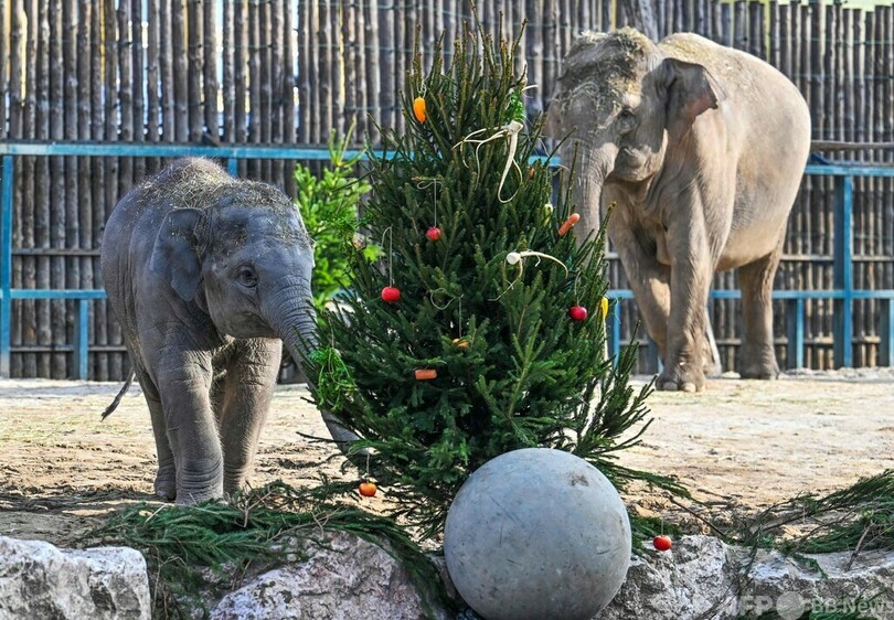 象の親子、プレゼントのXマスツリーに興味津々 ハンガリー
