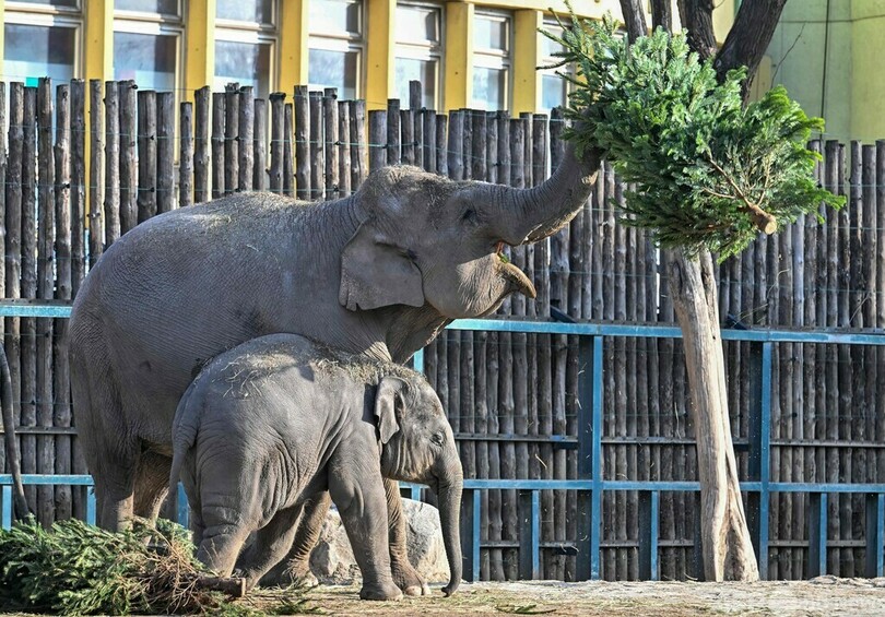 象の親子、プレゼントのXマスツリーに興味津々 ハンガリー