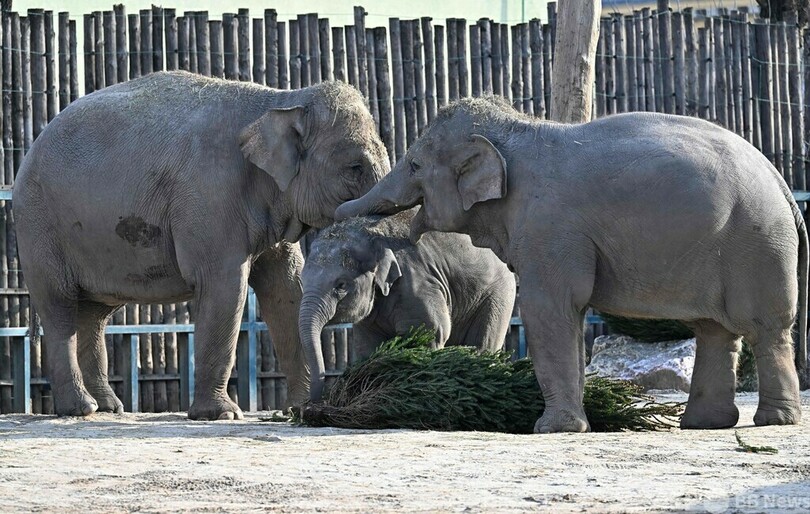 象の親子、プレゼントのXマスツリーに興味津々 ハンガリー