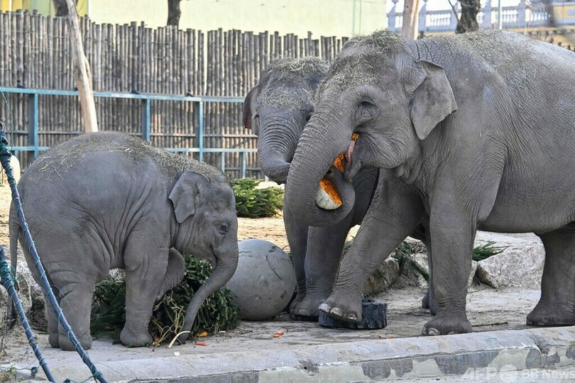 象の親子、プレゼントのXマスツリーに興味津々 ハンガリー