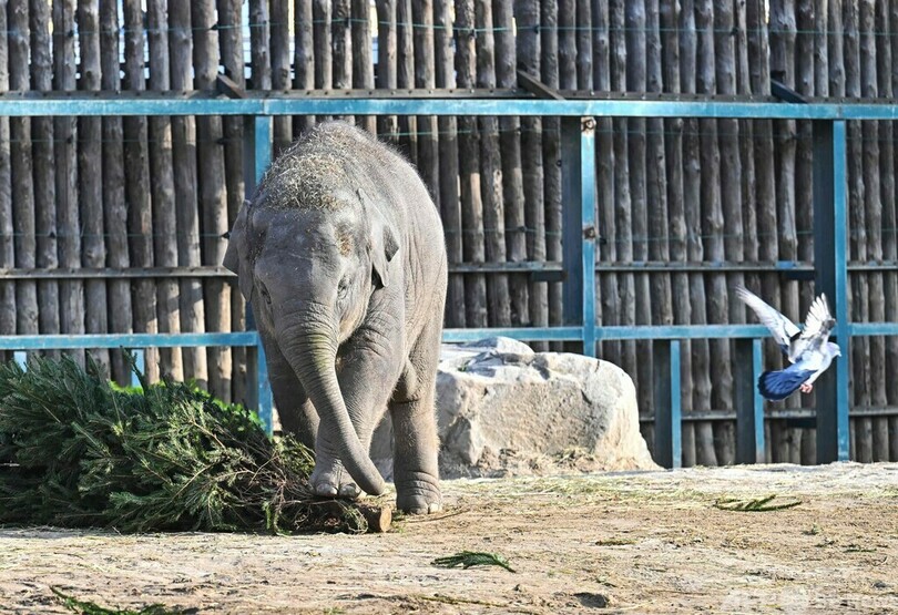 象の親子、プレゼントのXマスツリーに興味津々 ハンガリー
