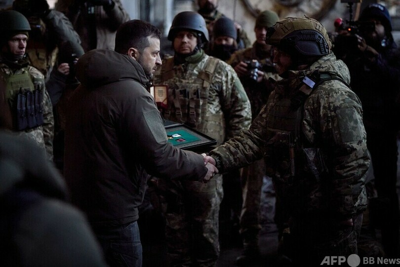 【12月20日 AFP】(写真追加)ウクライナのウォロディミル・ゼレンスキー(Volodymyr Zelensky)大統領は20日、ロシアによる侵攻で主戦場となっている東部前線のバフムート(Bakhmut)を訪問した。大統領府が発表した。