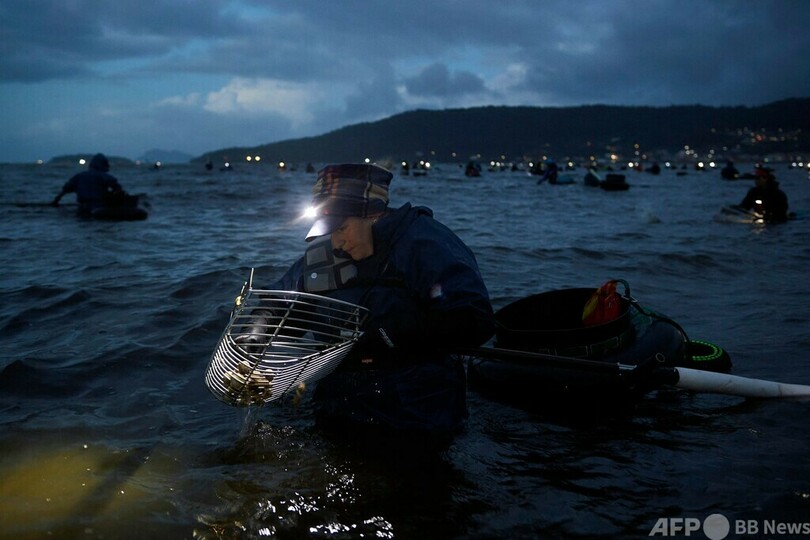 【12月26日 AFP】スペイン北西部ガリシア(Galicia)地方のノイア(Noia)入り江で、食用の二枚貝をレーキで集める「マリスカドーラ」。