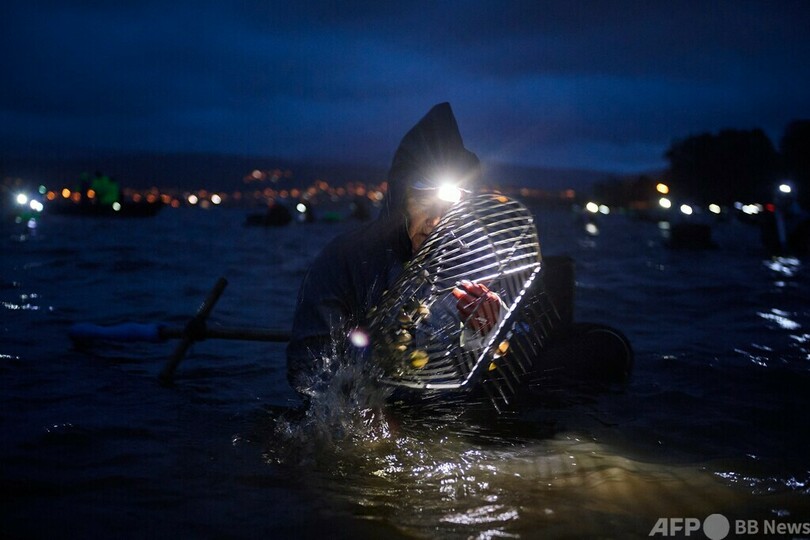 【12月26日 AFP】スペイン北西部ガリシア(Galicia)地方のノイア(Noia)入り江で、食用の二枚貝をレーキで集める「マリスカドーラ」。