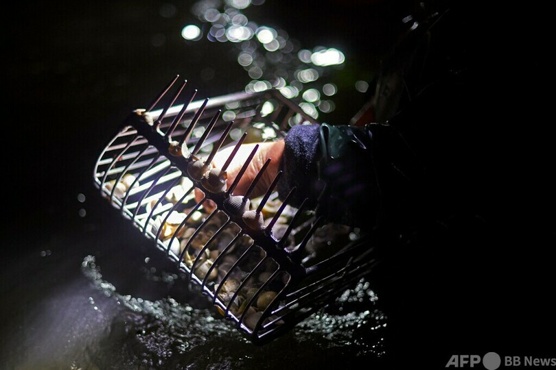 【12月26日 AFP】スペイン北西部ガリシア(Galicia)地方のノイア(Noia)入り江で、食用の二枚貝をレーキで集める「マリスカドーラ」。