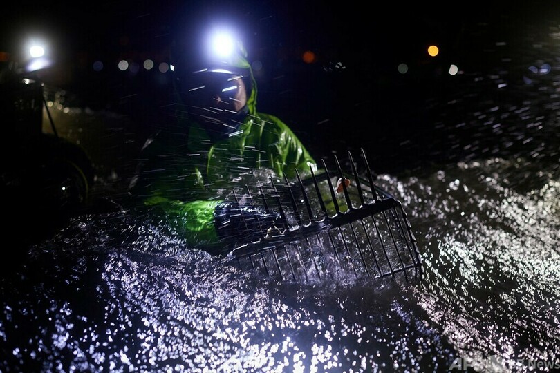 【12月26日 AFP】スペイン北西部ガリシア(Galicia)地方のノイア(Noia)入り江で、食用の二枚貝をレーキで集める「マリスカドーラ」。
