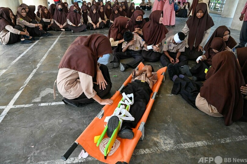 【12月23日 AFP】インドネシア・バンダアチェ(Banda Aceh)の中学校で23日、地震と津波の避難訓練が行われた。スマトラ(Sumatra)島沖地震に伴い発生したインド洋大津波から26日で18年を迎える。(c)AFP