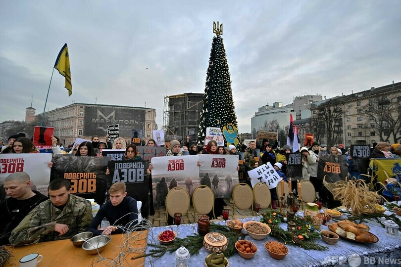 【12月25日 AFP】ウクライナの首都キーウでクリスマスイブの24日、南部マリウポリ(Mariupol)でロシア軍に拘束されたアゾフ連隊(Azov Regiment)隊員の解放を訴えるデモが行われた。