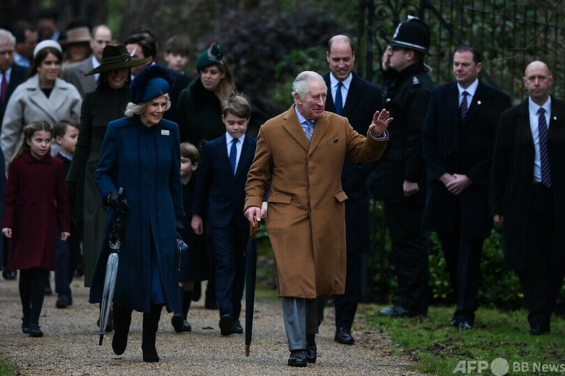 チャールズ国王は新型コロナウイルスが大流行する前の伝統にのっとり、今年のクリスマスはイングランド東部サンドリンガム(Sandringham)の別邸で過ごしており、同地での礼拝にはカミラ王妃(Queen Consort Camilla)、ウィリアム皇太子(Prince William)一家と共に参加した。(c)AFP/Joe JACKSON
