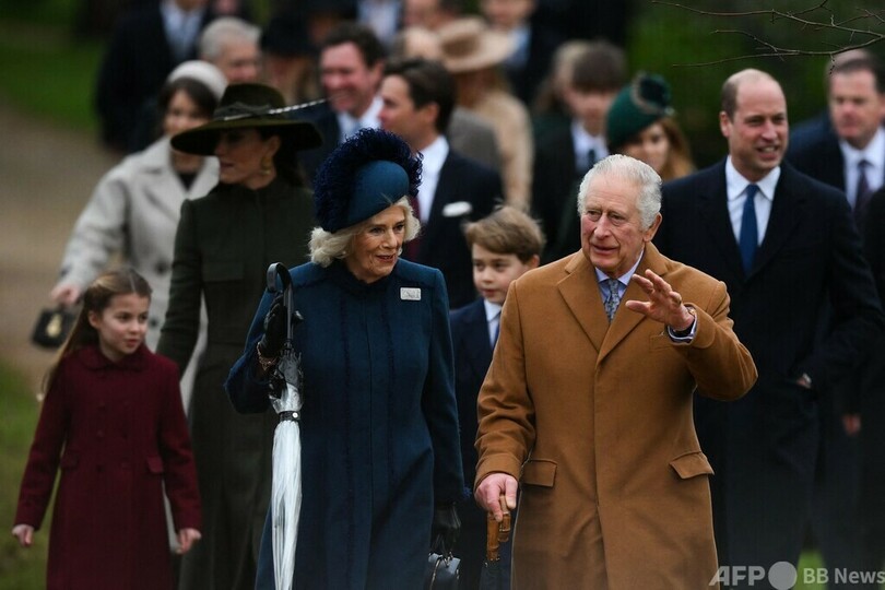 チャールズ国王は新型コロナウイルスが大流行する前の伝統にのっとり、今年のクリスマスはイングランド東部サンドリンガム(Sandringham)の別邸で過ごしており、同地での礼拝にはカミラ王妃(Queen Consort Camilla)、ウィリアム皇太子(Prince William)一家と共に参加した。(c)AFP/Joe JACKSON