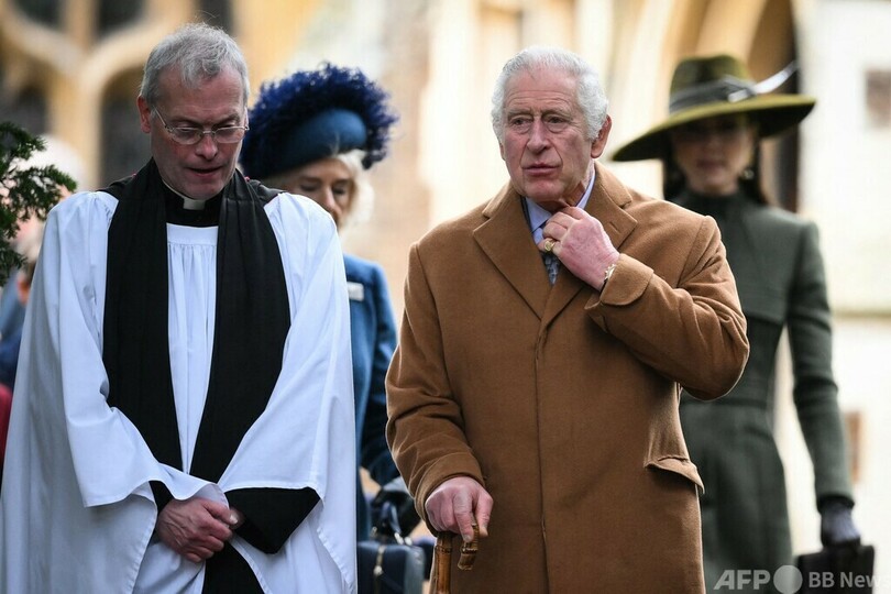 チャールズ国王は新型コロナウイルスが大流行する前の伝統にのっとり、今年のクリスマスはイングランド東部サンドリンガム(Sandringham)の別邸で過ごしており、同地での礼拝にはカミラ王妃(Queen Consort Camilla)、ウィリアム皇太子(Prince William)一家と共に参加した。(c)AFP/Joe JACKSON