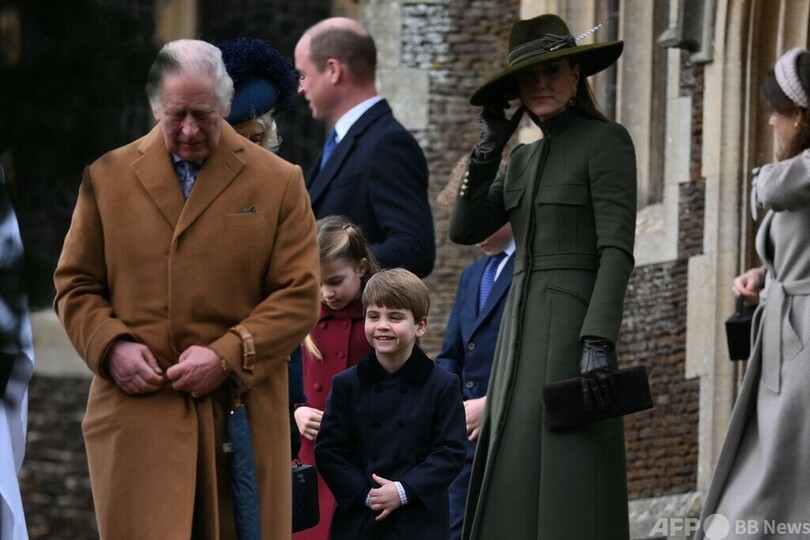 チャールズ国王は新型コロナウイルスが大流行する前の伝統にのっとり、今年のクリスマスはイングランド東部サンドリンガム(Sandringham)の別邸で過ごしており、同地での礼拝にはカミラ王妃(Queen Consort Camilla)、ウィリアム皇太子(Prince William)一家と共に参加した。(c)AFP/Joe JACKSON