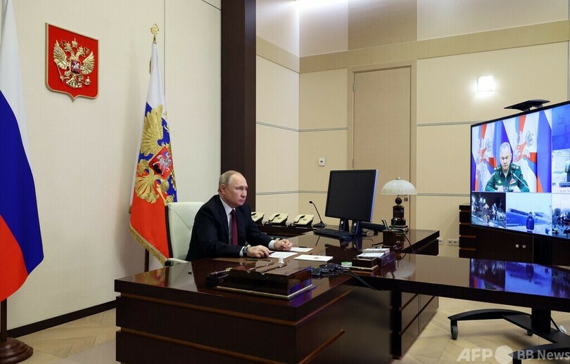 新型コロナウイルスの流行以来、公の場に姿を現すことを極力避けているプーチン氏は、今回の式典にもオンラインで参加し、新たな軍艦への国旗掲揚を指示。「われわれは各種船舶の建造ペースと量を増やし、最新鋭兵器を装備していく」と宣言した。(c)AFP