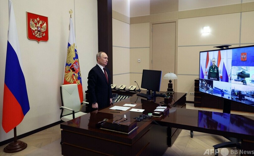 新型コロナウイルスの流行以来、公の場に姿を現すことを極力避けているプーチン氏は、今回の式典にもオンラインで参加し、新たな軍艦への国旗掲揚を指示。「われわれは各種船舶の建造ペースと量を増やし、最新鋭兵器を装備していく」と宣言した。(c)AFP