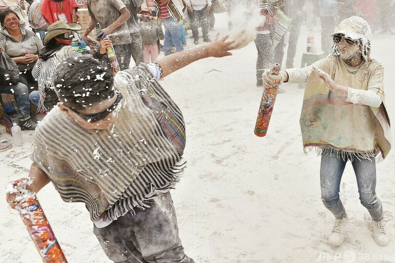【1月7日 AFP】南米コロンビア・パスト(Pasto)で今週、「黒と白のカーニバル(Carnival of Blacks and Whites)」が開催された。カーニバルの一環として行われるパレードでは、参加者がお互いに白い泡を吹きかけ合い、会場は泡だらけになった。