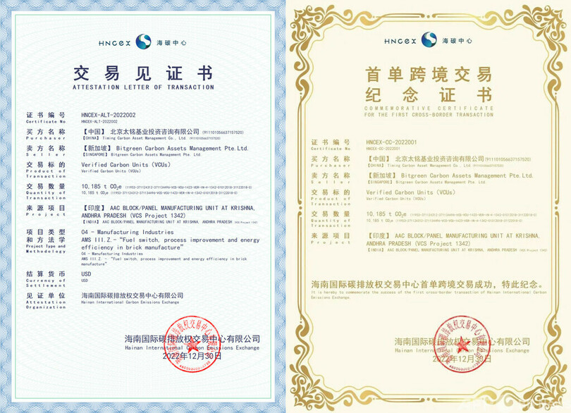 今回取引された製品は、世界的に認められた検証済み炭素基(VCS)下の検証済み削減量(VCUs)で、インドからのもので、取引量は1万185トンです。同センターはこの取引のために仲介と認証サービスを提供し、双方に取引証明書と記念証明書を発行しました。