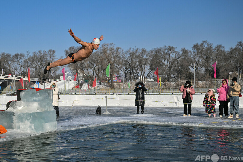 【1月6日 AFP】中国東北部・黒竜江省(Heilongjiang)のハルビン(Harbin)で5日、毎年恒例の「ハルビン国際氷雪祭(Harbin International Ice and Snow Festival)」の開幕を前に、松花江(Songhua river)の氷をくりぬいたプールで寒中水泳大会が行われた。(c)AFP