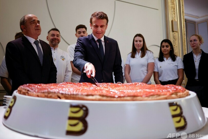 マクロン仏大統領、巨大ガレット・デ・ロワ切り分け