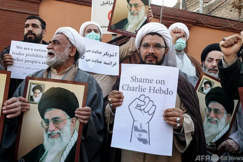 【1月9日 AFP】フランスの風刺週刊紙シャルリー・エブド(Charlie Hebdo)が、反体制デモが続いているイランの最高指導者アリ・ハメネイ(Ali Khamenei)師の風刺画を掲載したことを受け、首都テヘランのフランス大使館前に8日、イラン人数十人が集結して抗議した。