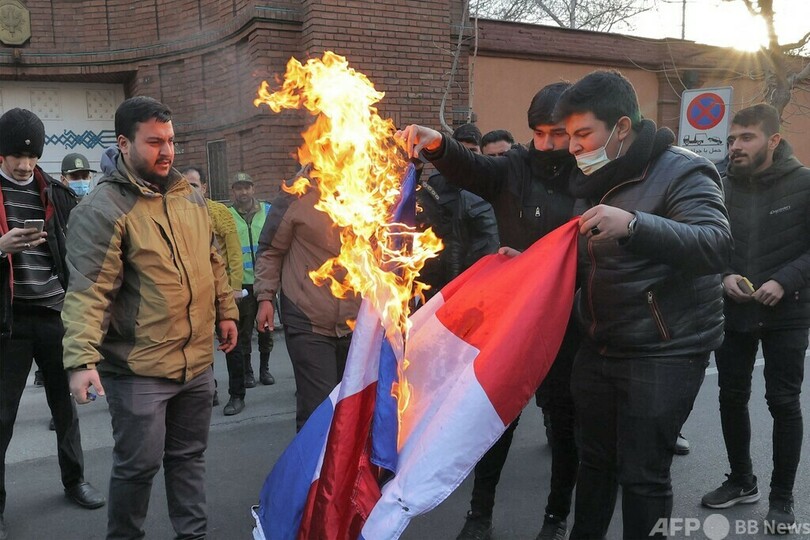仏大使館前でハメネイ師風刺画に抗議 イラン