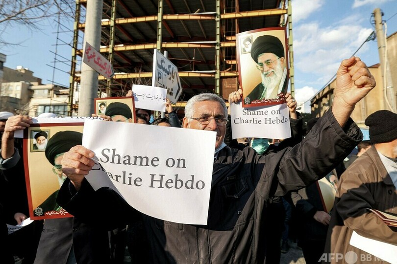 【1月9日 AFP】フランスの風刺週刊紙シャルリー・エブド(Charlie Hebdo)が、反体制デモが続いているイランの最高指導者アリ・ハメネイ(Ali Khamenei)師の風刺画を掲載したことを受け、首都テヘランのフランス大使館前に8日、イラン人数十人が集結して抗議した。