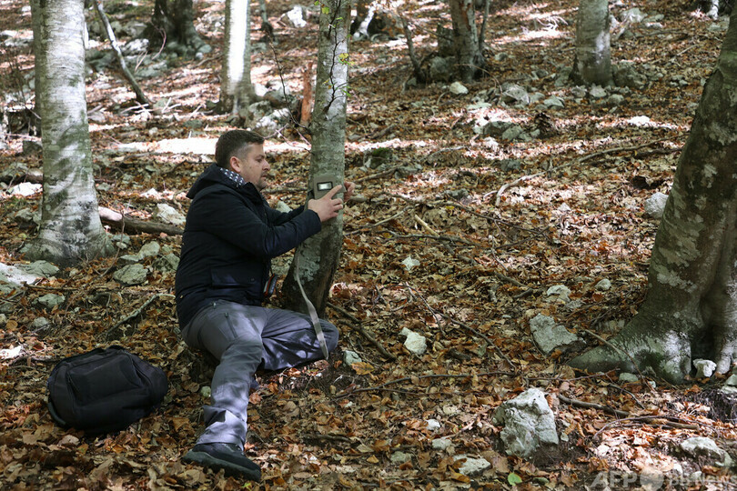 アルバニアの自然環境保護団体PPNEAはこの15年間、バルカンオオヤマネコの保護に努めてきた。AFPの取材中、PPNEAの個体数回復プログラムに参加する2人の専門家はプレスパ湖畔のマリイタテ(Mali i Thate)山中に自動撮影カメラを慎重に設置していた。
