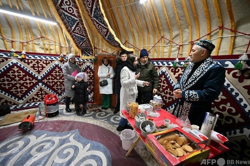 【1月11日 AFP】ウクライナの首都キーウ近郊ブチャ(Bucha)に9日、中央アジア・カザフスタンの伝統的な移動式住居「ユルタ(Yurt)」が設置され、中で食べ物やお茶、コーヒーなどが振る舞われた。