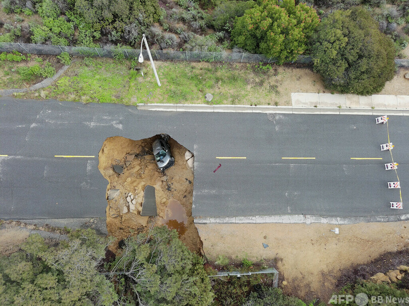 【1月18日 AFP】米カリフォルニア州ロサンゼルスのチャッツワース(Chatsworth)で、大雨で陥没した道路の穴に落ちた2台の車両を捉えた空撮写真。同州では大規模な嵐によって各地で洪水が発生した。(c)AFP