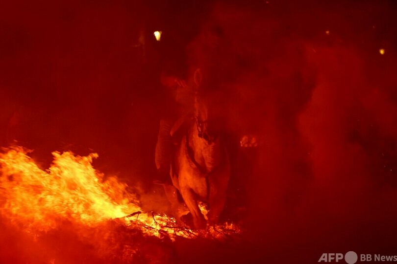 【1月21日 AFP】スペインの首都マドリードの西に位置するサンバルトロメデピナレス(San Bartolome de Pinares)で今週、動物の守護聖人である聖アントニオ(San Antonio Abad)を祭る伝統行事「ルミナリアス(Luminarias)」が行われた。祭りでは馬にまたがって炎を跳び越える騎手の姿が見られた。(c)AFP