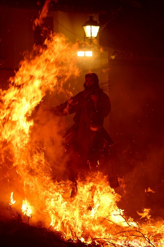 【1月21日 AFP】スペインの首都マドリードの西に位置するサンバルトロメデピナレス(San Bartolome de Pinares)で今週、動物の守護聖人である聖アントニオ(San Antonio Abad)を祭る伝統行事「ルミナリアス(Luminarias)」が行われた。祭りでは馬にまたがって炎を跳び越える騎手の姿が見られた。(c)AFP