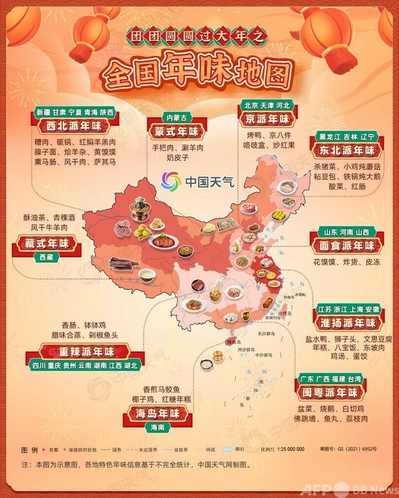 【1月18日 CGTN Japanese】大みそかの夜に家族全員が集まって「年夜飯」と呼ばれる年越し料理を食べるのは中国人の春節(旧正月、今年は1月22日)の伝統であり、国土の広い中国では年越し料理も地域ごとに豊かな特色があります。中国天気ネットはこのほど、全国の年越し料理地図を発表し、各地域の特色ある年越し料理を10種類にまとめました。