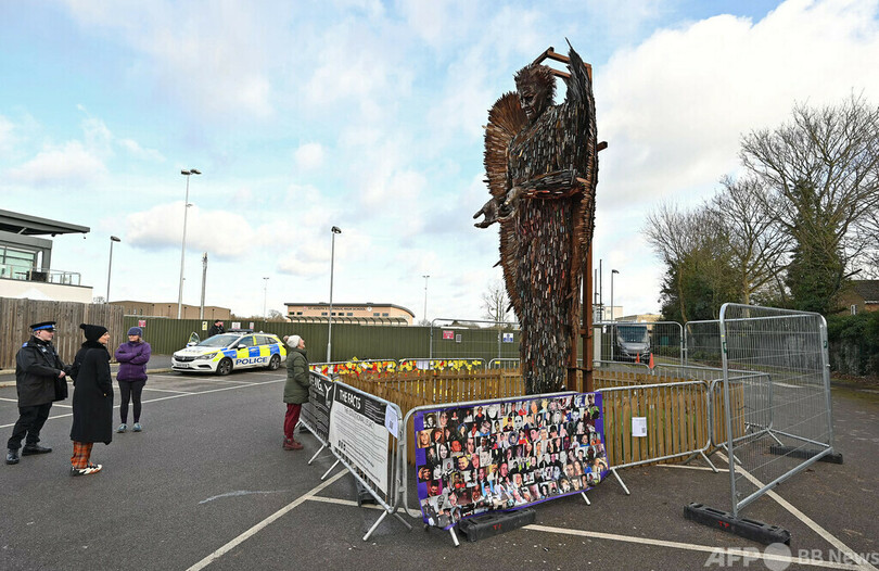 【1月29日 AFP】英ロンドン西部スラウ(Slough)に展示されたモニュメント「ナイフ・エンジェル(Knife Angel)」。反暴力、反攻撃を象徴するこのモニュメントはアーティストのアルフィー・ブラッドリー(Alfie Bradley)さんとブリティッシュ・アイロンワーク・センター(British Ironworks Centre)が制作し、英国で起きたナイフが使われた犯罪を象徴している。高さは約8メートルで、匿名の寄付で集まった10万本以上のナイフによって作られた。(c)AFP