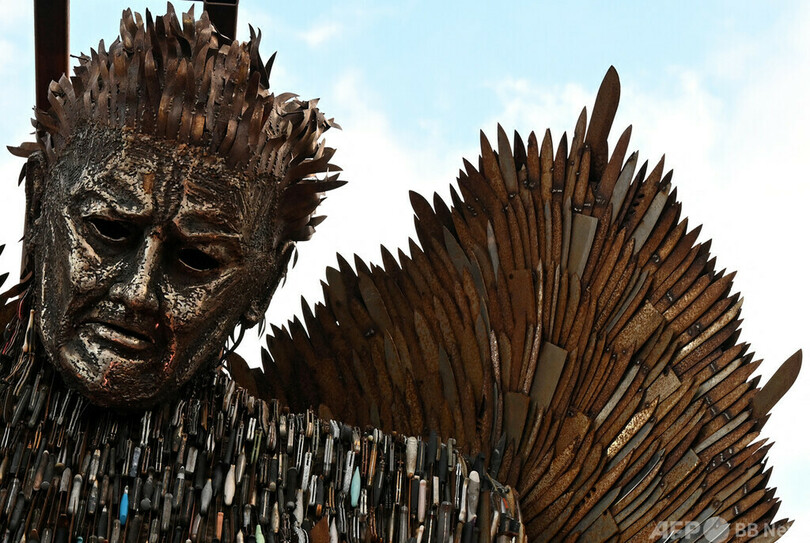【1月29日 AFP】英ロンドン西部スラウ(Slough)に展示されたモニュメント「ナイフ・エンジェル(Knife Angel)」。反暴力、反攻撃を象徴するこのモニュメントはアーティストのアルフィー・ブラッドリー(Alfie Bradley)さんとブリティッシュ・アイロンワーク・センター(British Ironworks Centre)が制作し、英国で起きたナイフが使われた犯罪を象徴している。高さは約8メートルで、匿名の寄付で集まった10万本以上のナイフによって作られた。(c)AFP