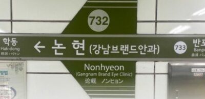 駅名の表示には「江南ブランド眼科」の名前が添えられ、車内アナウンスでも「この駅は論峴、江南ブランド眼科駅です」と紹介される。