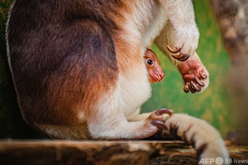【1月27日 AFP】英イングランドのチェスター動物園(Chester Zoo)でこのほど、昨年7月に生まれた絶滅危惧種のセスジキノボリカンガルーの赤ちゃんが、初めて母親の袋から頭を出したところが撮影された。