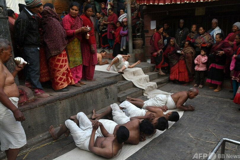 【2月5日 AFP】ネパール・カトマンズ郊外のバクタプル(Bhaktapur)で、ヒンズー教の女神「スワスタニ」を祝うマダブナラヤン(Madhav Narayan)祭が行われた。儀式の一環として、地面を転がりながら祈りをささげる信者たち。(c)AFP