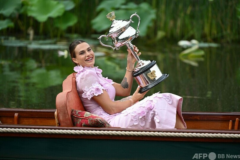 華やかなピンクのドレスに身を包み、いつものテニスシューズではなくハイヒールを履いたサバレンカは、優勝トロフィーのダフネ・アクハースト・メモリアル・カップ(Daphne Akhurst Memorial Cup)を手に握りしめ、ボートに乗って湖を周遊した。