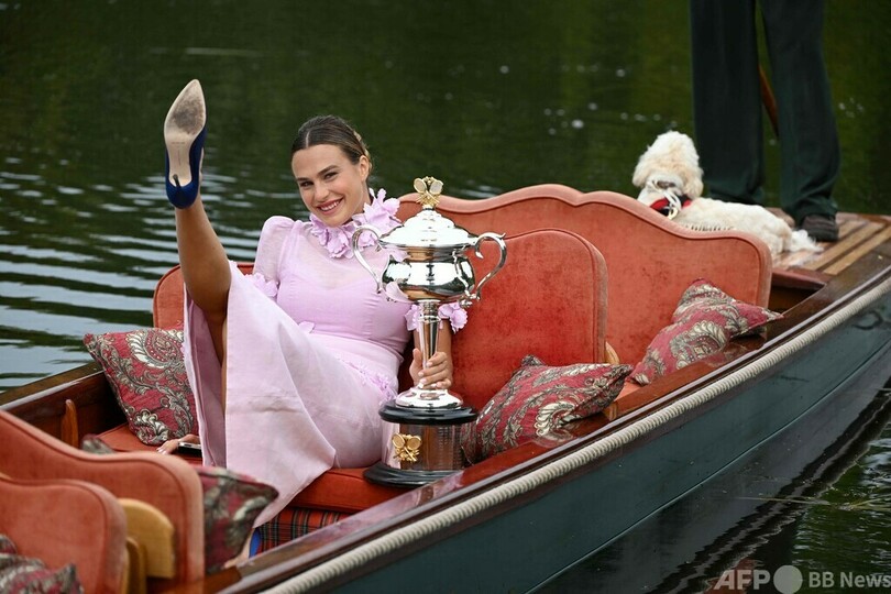 華やかなピンクのドレスに身を包み、いつものテニスシューズではなくハイヒールを履いたサバレンカは、優勝トロフィーのダフネ・アクハースト・メモリアル・カップ(Daphne Akhurst Memorial Cup)を手に握りしめ、ボートに乗って湖を周遊した。