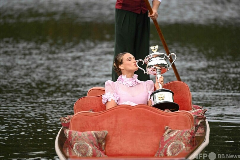 華やかなピンクのドレスに身を包み、いつものテニスシューズではなくハイヒールを履いたサバレンカは、優勝トロフィーのダフネ・アクハースト・メモリアル・カップ(Daphne Akhurst Memorial Cup)を手に握りしめ、ボートに乗って湖を周遊した。