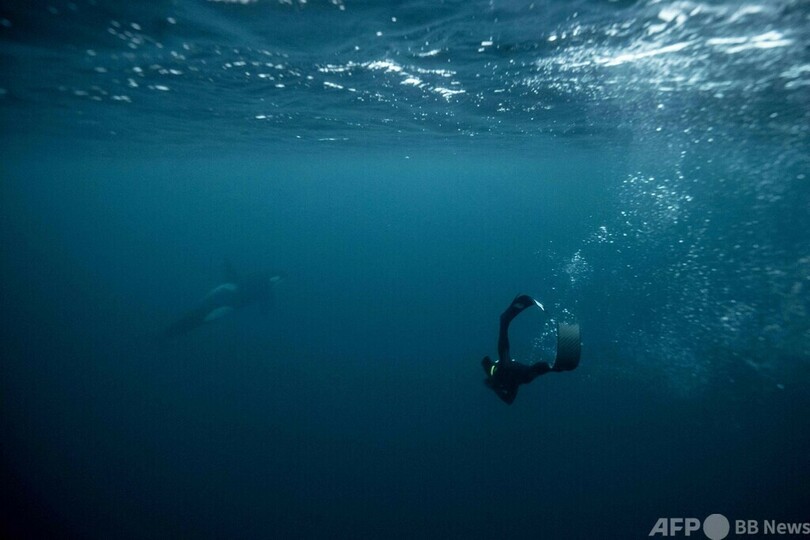 ノルウェーの北極海でシャチと泳ぐ フランス人フリーダイバー