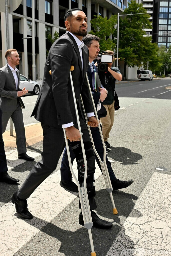 膝のけがで先月の全豪オープン(Australian Open Tennis Tournament 2023)を欠場したキリオスはこの日、現在の恋人と母親に付き添われ、松葉づえをついて脚を引きずりながら裁判所に入った。