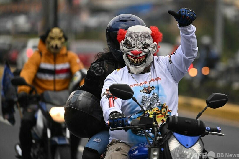 「神がエスキプラスに行くことを許してくれたのはこれで12回目だ」とバイカーの一人、角がついた骸骨のマスクを着けたアルベルト・ゴディネスさん(43)は語る。他の参加者も悪魔や映画の登場人物などのマスクを着けている。
