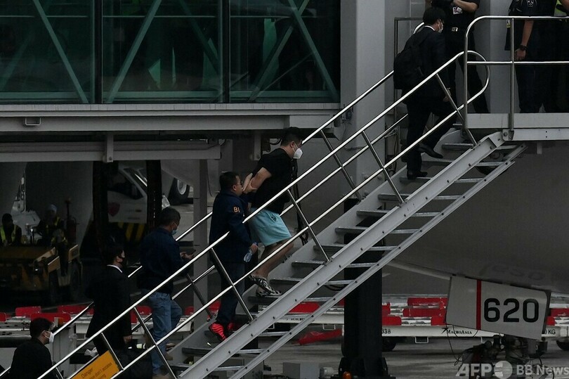 日本側に身柄が引き渡されたのは、今村磨人(Kiyoto Imamura)、藤田聖也(Toshiya Fujita)の両容疑者。2人は捜査員に付き添われ、マニラの空港で航空機に搭乗した。(c)AFP