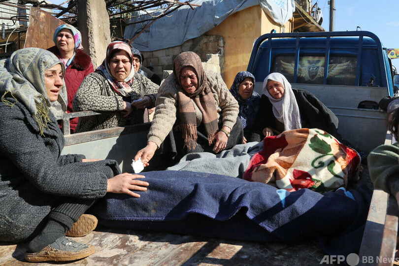 地震の被害を受けたシリア・アレッポで、遺体のそばで涙を流す人々(2023年2月6日撮影)。(c)LOUAI BESHARA / AFP