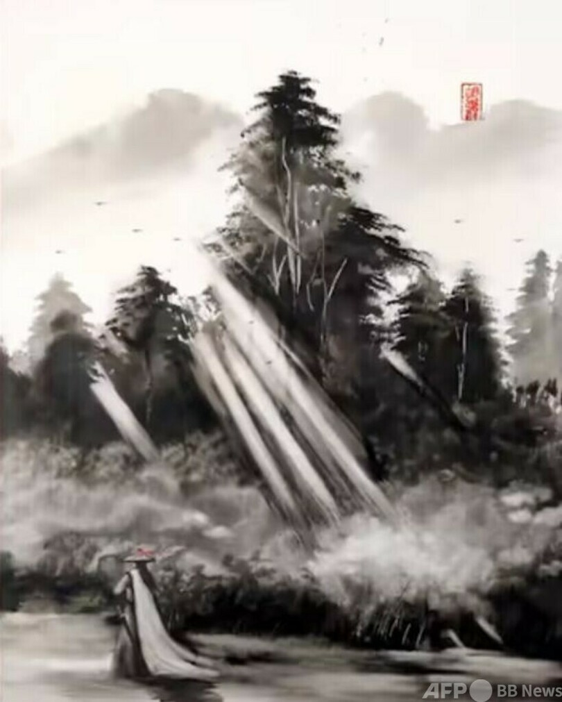 胡さんは幼い頃から武侠小説やドラマに影響を受け、「武侠への憧れ」を抱いていました。高校から絵画を学び始め、最初は油絵で武侠の世界を表現しようと思いましたが、中国の水墨画が武侠の境地を最も表現できると考えるようになりました。靴ブラシやほうき、トイレットペーパーなど日常の至る所にあるものを筆にして絵を描いています。胡さんは「僕にとってはむしろペンよりも日用品で描く方がやりやすい」と話しています。1枚の絵を仕上げるのに30~40分かかるとのことです。(c)CGTN Japanese/AFPBB News