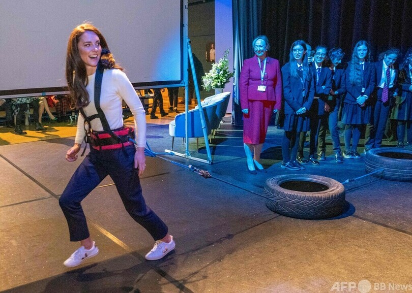 キャサリン妃はチャンディさんが取り組んだ筋力トレーニングの一つ、タイヤ引きに挑戦した。(c)AFP